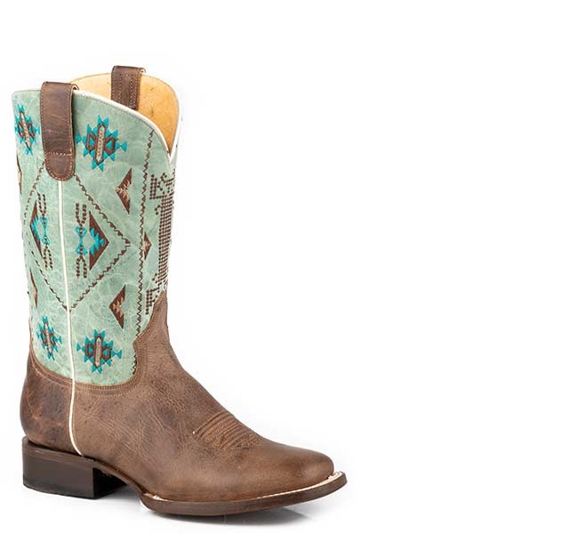 Broderie native sur tige en cuir turquoise bruni